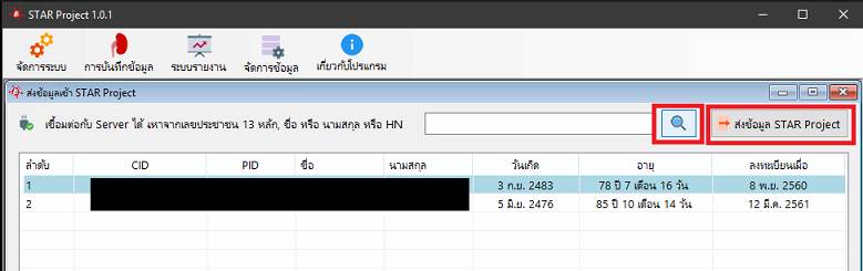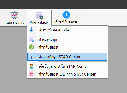 1. การส่งข้อมูลเข้า STAR Center สามารถทำได้เมื่อนำเข้า 43 แฟ้ม และลงทะเบียนผู้ป่วยแล้ว โดยไปที่เมนู จัดการข้อมูล > ส่งออกข้อมูล STAR Center